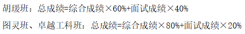 7.拟录取:按照总成绩高低排序,确定录取学生名单。对于总成绩相同的考生,则依次比较面试成绩、笔试成绩。若成绩仍相同者,胡瑗班依次比较高考语文、外语成绩,图灵班、卓越工科班依次比较高考数学、物理成绩,均换算成百分制。