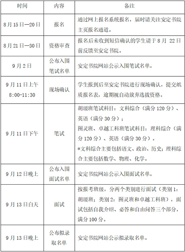 4.笔试:胡瑗班考核内容为文科综合+英语,图灵班、卓越工科班考核内容为理科综合+英语。