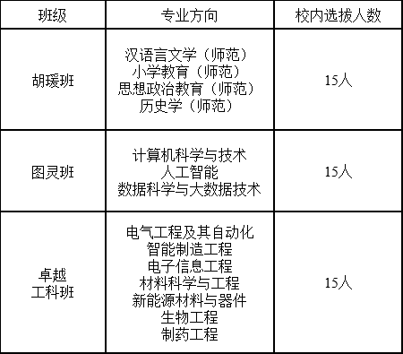 1.报名:符合条件的学生自愿报名。因考试内容不同,报考胡瑗班者不可兼报其他班级,图灵班、卓越工科班可兼报,但总成绩排名靠前者优先按第一志愿录取。