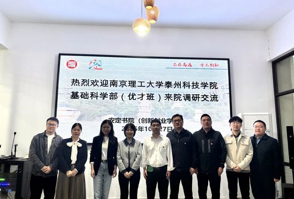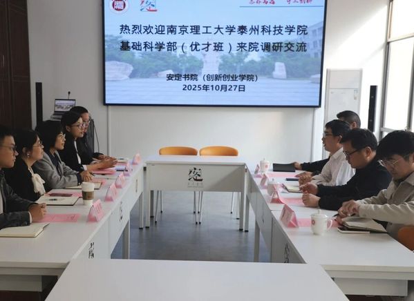 2025年10月27日,南京理工大学泰州科技学院基础科学部(优才班)一行在副主任、直属党支部书记宗波的带领下,莅临我院调研交流。座谈会在安定书院书吧举行,气氛热烈融洽。安定书院执行院长吕小芬、党总支书记管雪娇等班子成员出席接待,并与来宾进行了深入务实的交流。